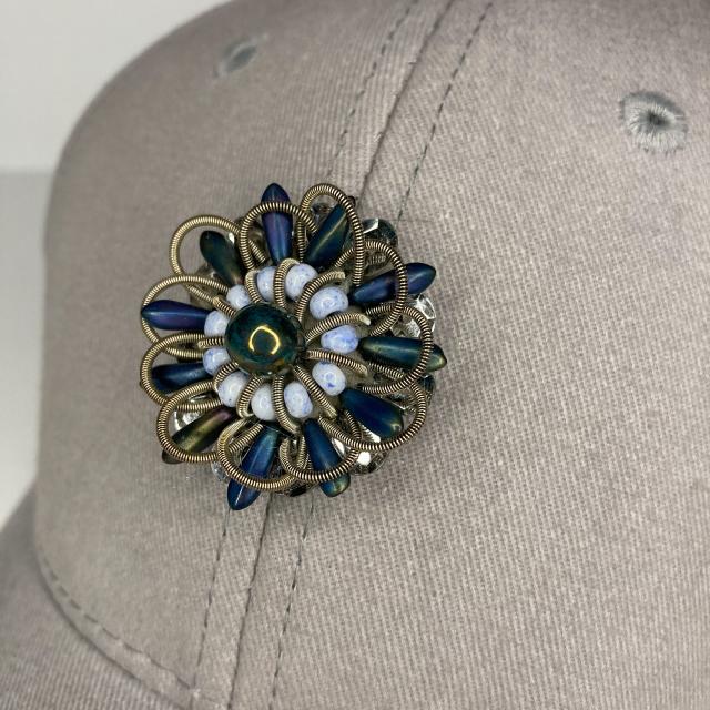 Ručně vytvořená výšivka je vyrobena z recyklovaných materiálů, plastových a skleněných korálků.