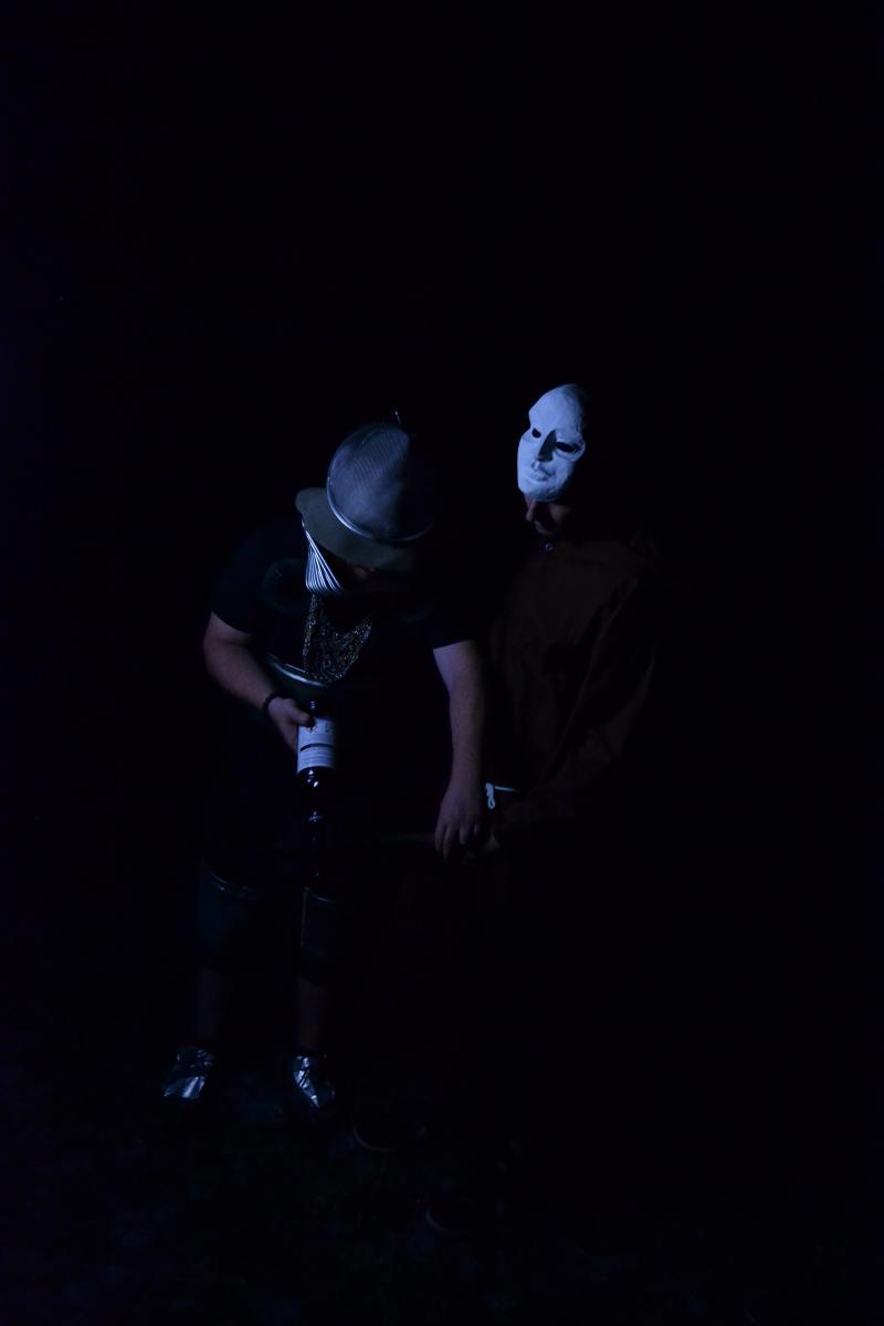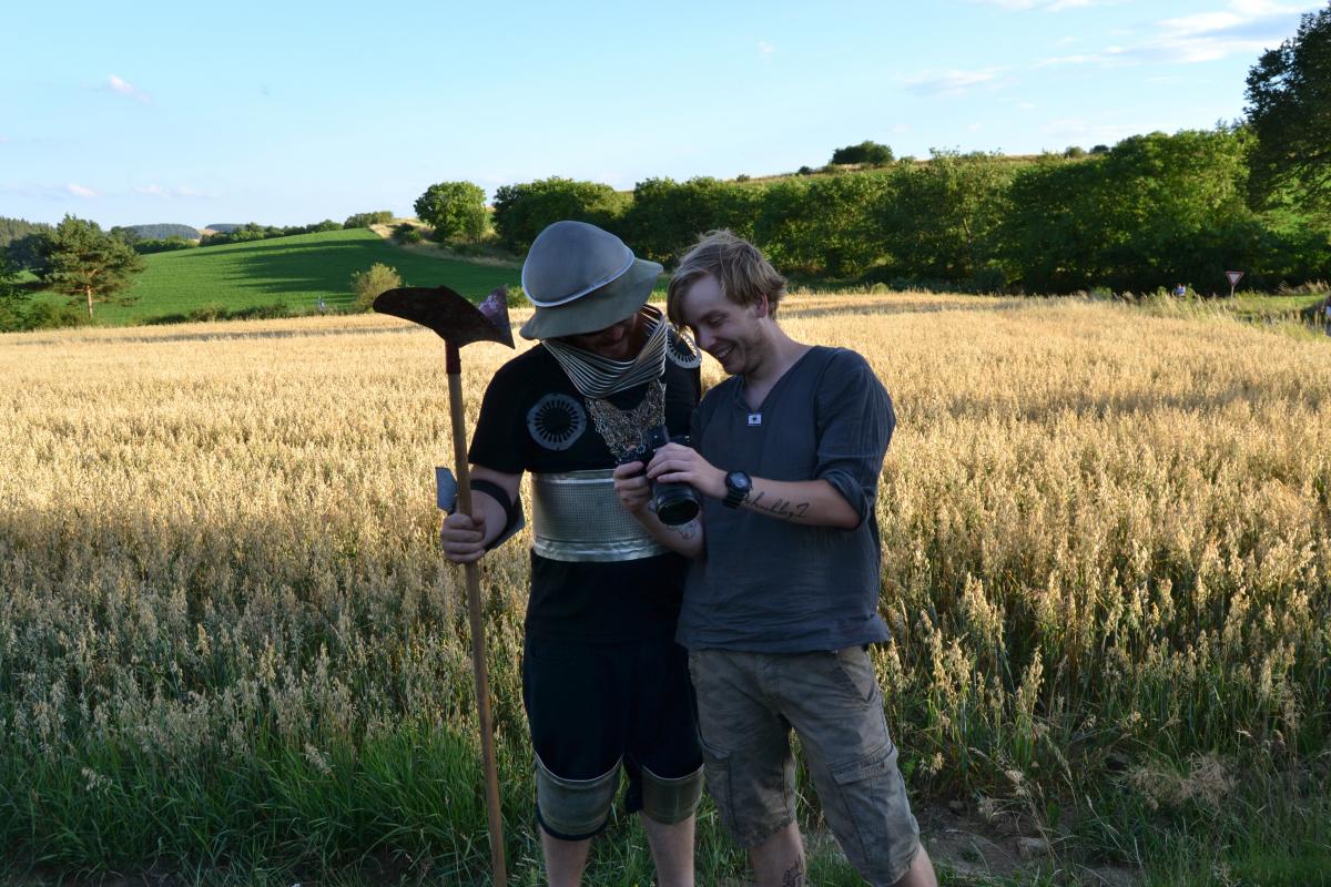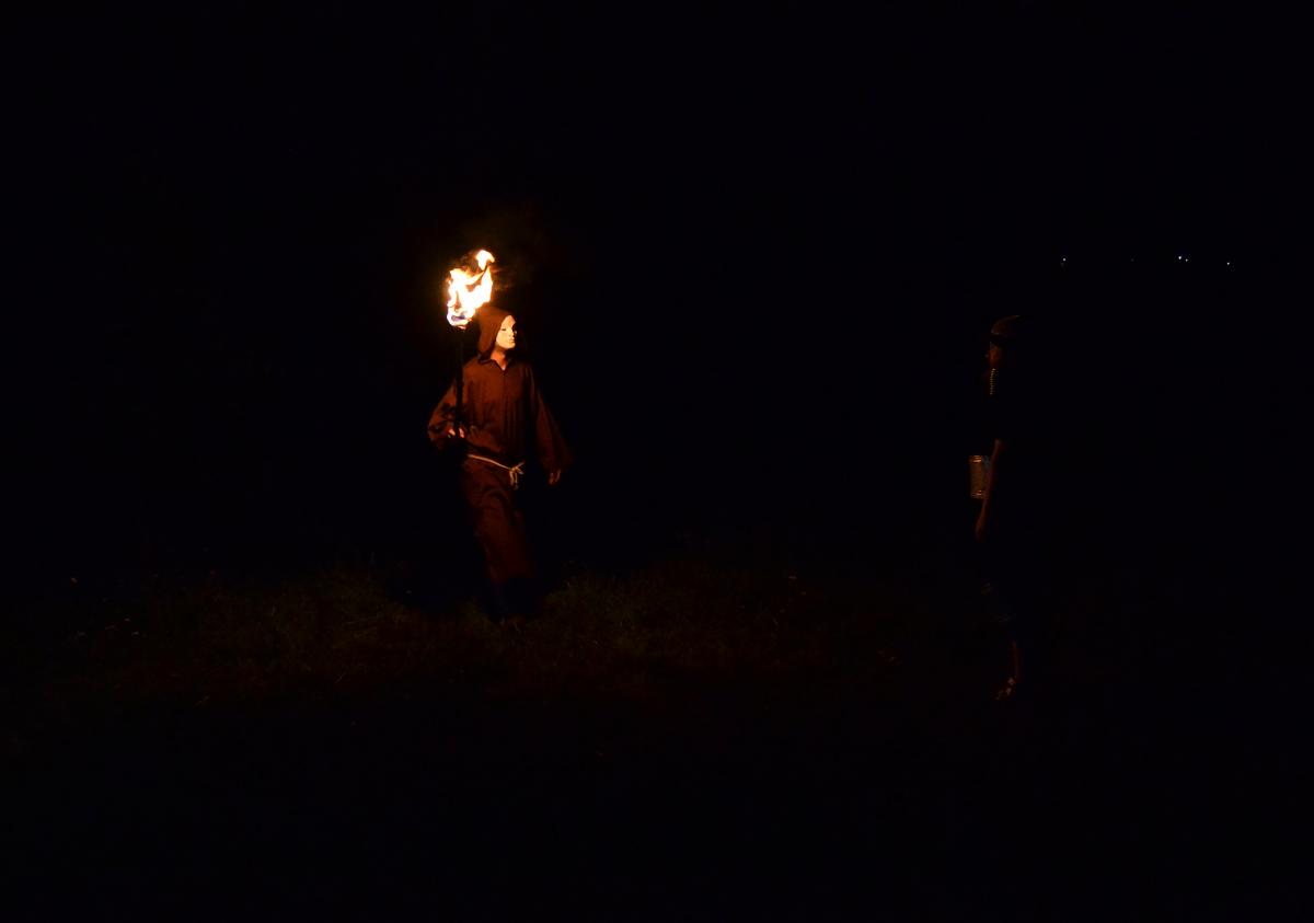 Za tmy přišly na řadu plánované noční scény. Vyslali jsme Jirku oblečeného do kápě, s maskou na obličeji a hořící loučí v ruce, aby si stoupl doprostřed pole. Pokud šel někdo okolo, doufáme, že z toho nemá do teď noční můry. Scenérie to byla totiž velice děsivá, zvlášť pro lidi, kteří by nevěděli, co tam tvoříme.