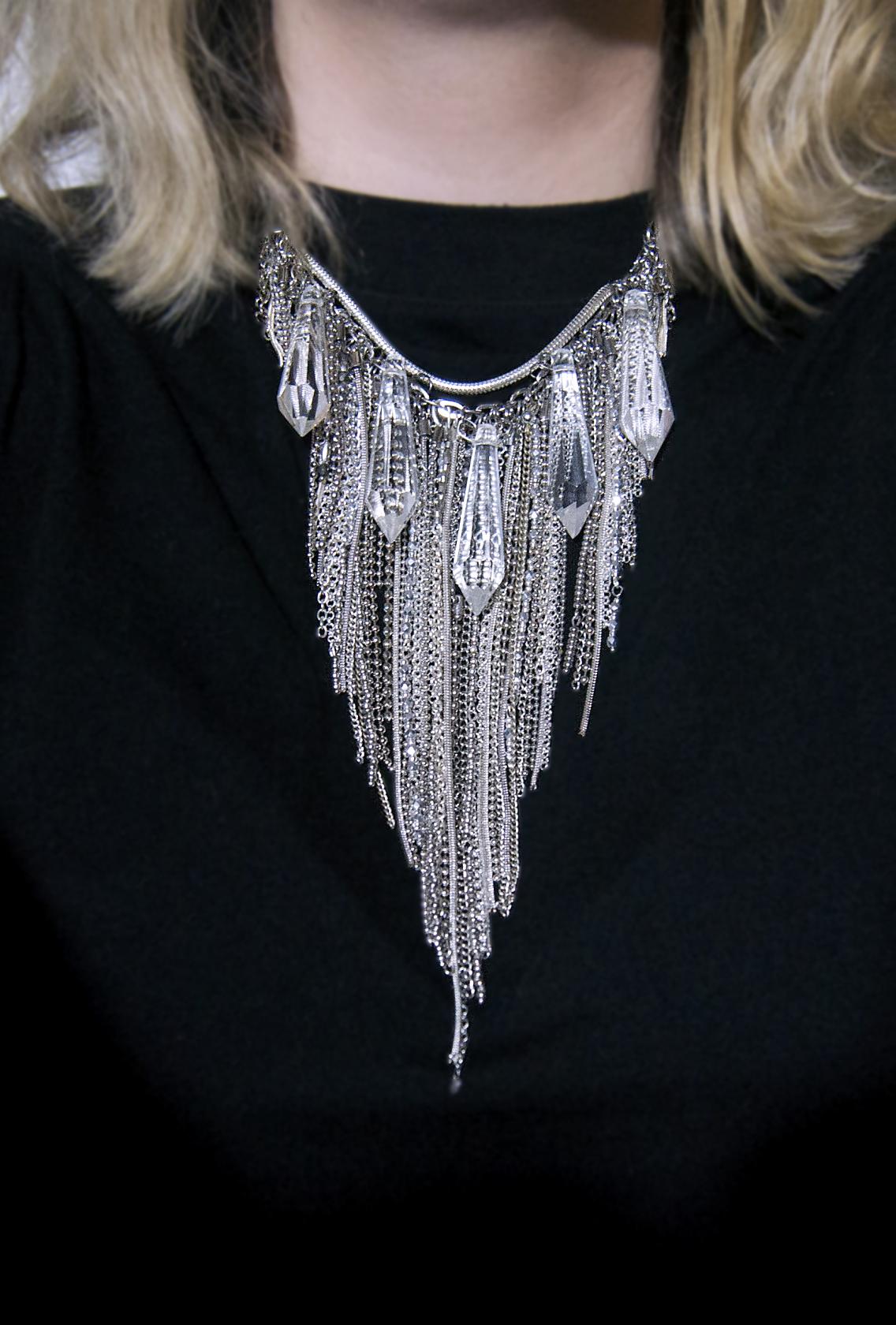 Náhrdelník je vyroben z různých kovových řetízků, zajímavé jsou například kuličkové řetízky z klíčenek nebo zbytky hadích řetízků, které jsem vlepovala do koncovek. Vše zvýraznily skleněné komponenty ze starého lustru. Stříbrná je pro mě barva této zimy, takže to byla pro silvestrovský večírek jasná volba .