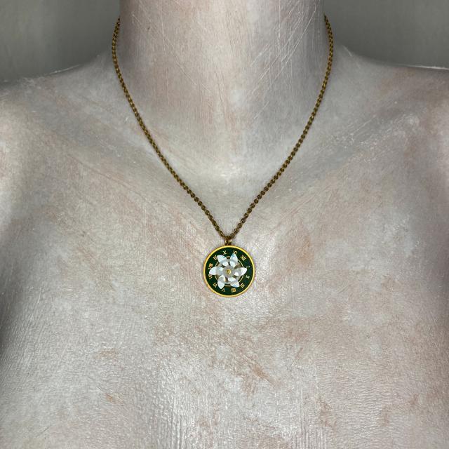 Ručně vyrobený přívěšek, jehož základ tvoří ciferník starých rozbitých hodinek. Okvětní lístky jsou vyříznuty z plochého kabelu, střed tvoří plastový mechanismus z tiskárny. Vše je doplněno kovovými součástkami. Produkt obsahuje i bižuterní řetízek.