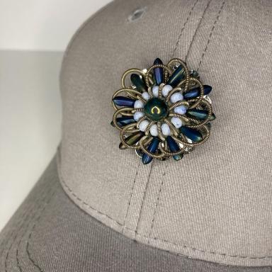 Ručně vytvořená výšivka je vyrobena z recyklovaných materiálů, plastových a skleněných korálků.