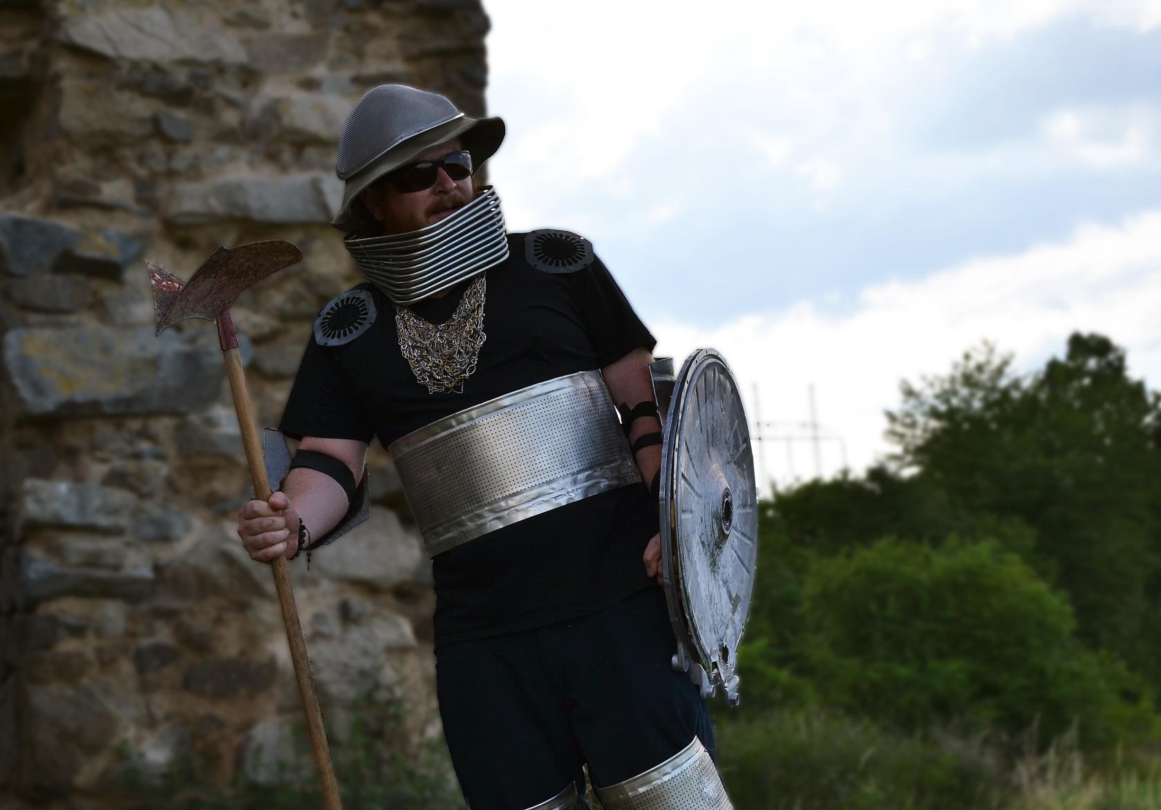 Don Quijotovské téma svádělo vyhrát si s kostýmem, který jsme s Luckou navrhovaly a vyráběly společně. Štít a brnění sestávalo z různých součástek a zajímavých plechů ze šroťáku. Vše jsme připevňovali na moderní oblečení, takže vznikl zajímavý kontrast a novodobý rytíř mohl vyrazit na svou pouť stylově zakončenou bojem s větrnými mlýny.