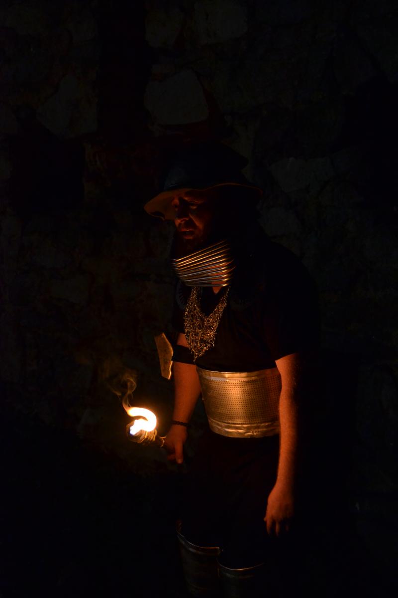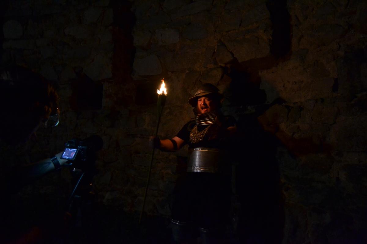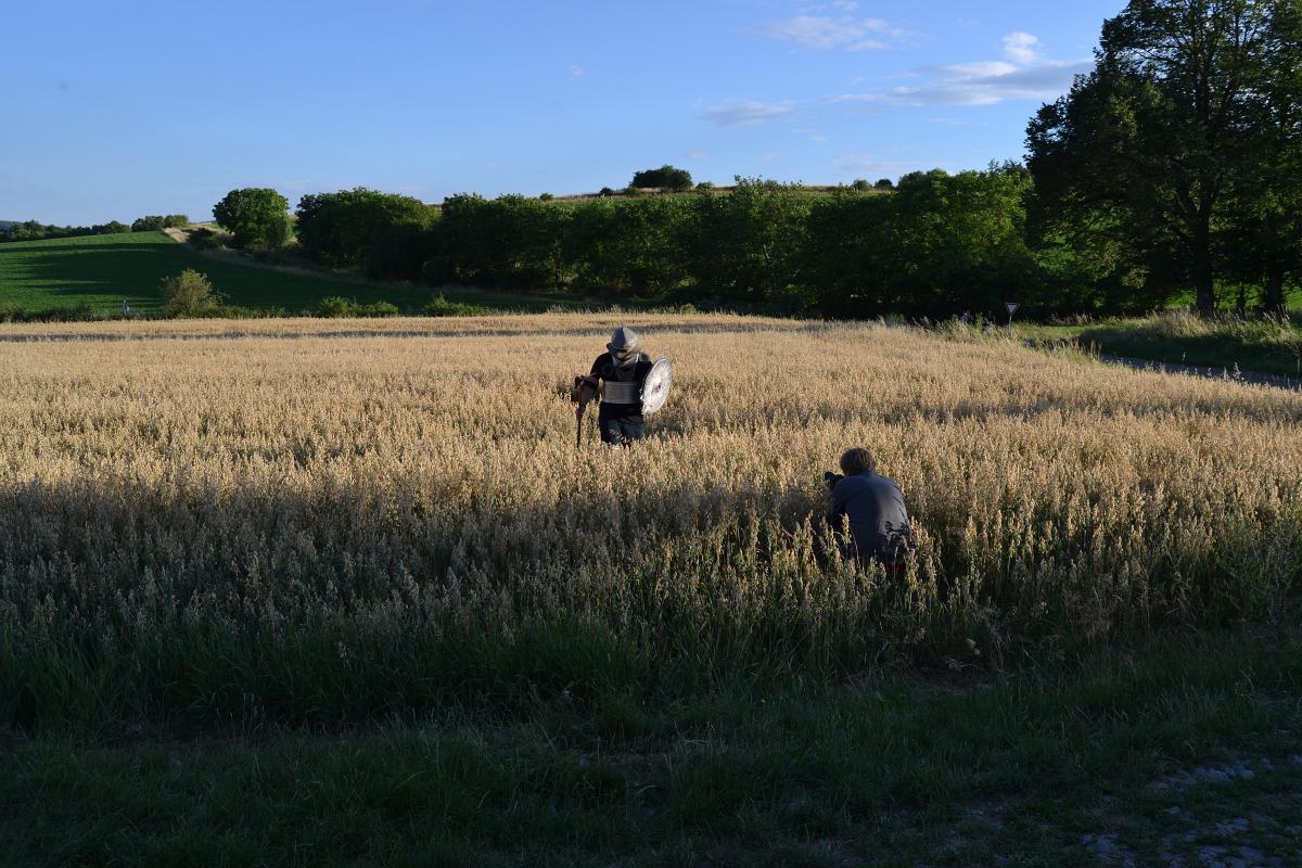 Za tmy přišly na řadu plánované noční scény. Vyslali jsme Jirku oblečeného do kápě, s maskou na obličeji a hořící loučí v ruce, aby si stoupl doprostřed pole. Pokud šel někdo okolo, doufáme, že z toho nemá do teď noční můry. Scenérie to byla totiž velice děsivá, zvlášť pro lidi, kteří by nevěděli, co tam tvoříme.