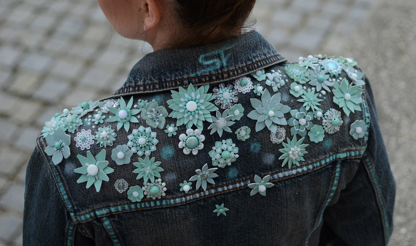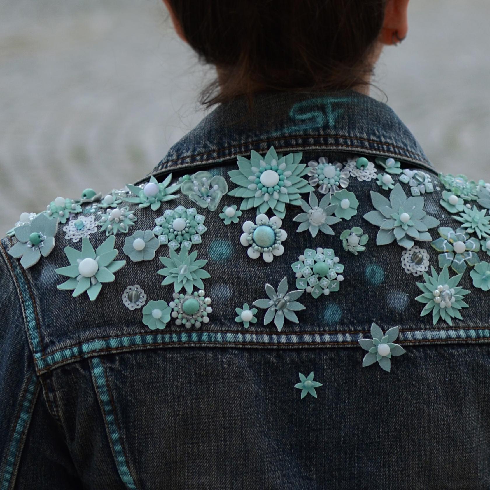 A je to tady. Plocha na kšiltovkách a náhrdelnících mi byla malá a tak přichází jeansové sako dozdobené v mé dílně!!!