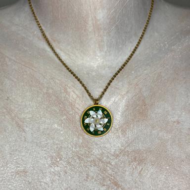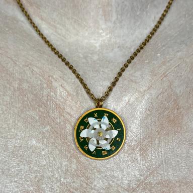 Ručně vyrobený přívěšek, jehož základ tvoří ciferník starých rozbitých hodinek. Okvětní lístky jsou vyříznuty z plochého kabelu, střed tvoří plastový mechanismus z tiskárny. Vše je doplněno kovovými součástkami. Produkt obsahuje i bižuterní řetízek.